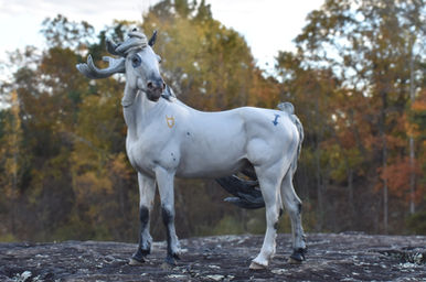 Dust Devil resin painted to a few spot appaloosa with a sock. He has had four feathers added to the sculpture. The colored markings are derived from those used by Native American tribes to give their horses strength and enhanced senses as well as mark the rider's accomplishments. His symbols are what may have been painted on a horse before or after a successful hunt. This piece has been completed in oils and acrylics. He's sealed with a matte varnish, his eyes are glossed.